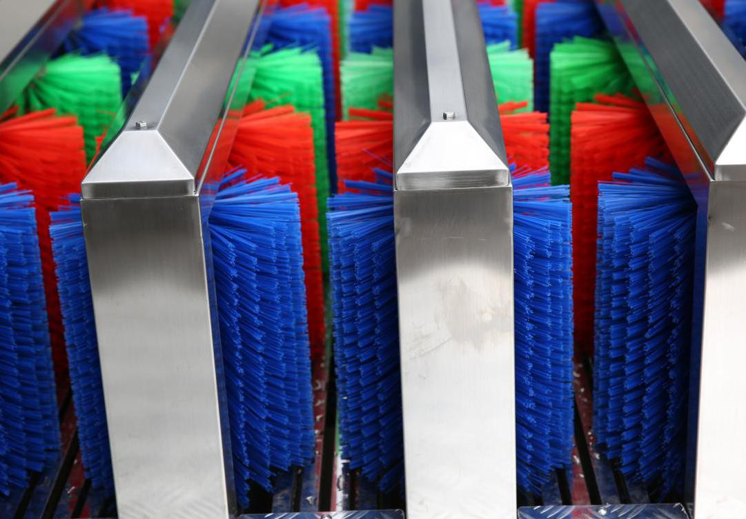 2、 電機(jī)驅(qū)動(dòng)清洗臺(tái)上的 5 組刷子,高壓噴淋清水。